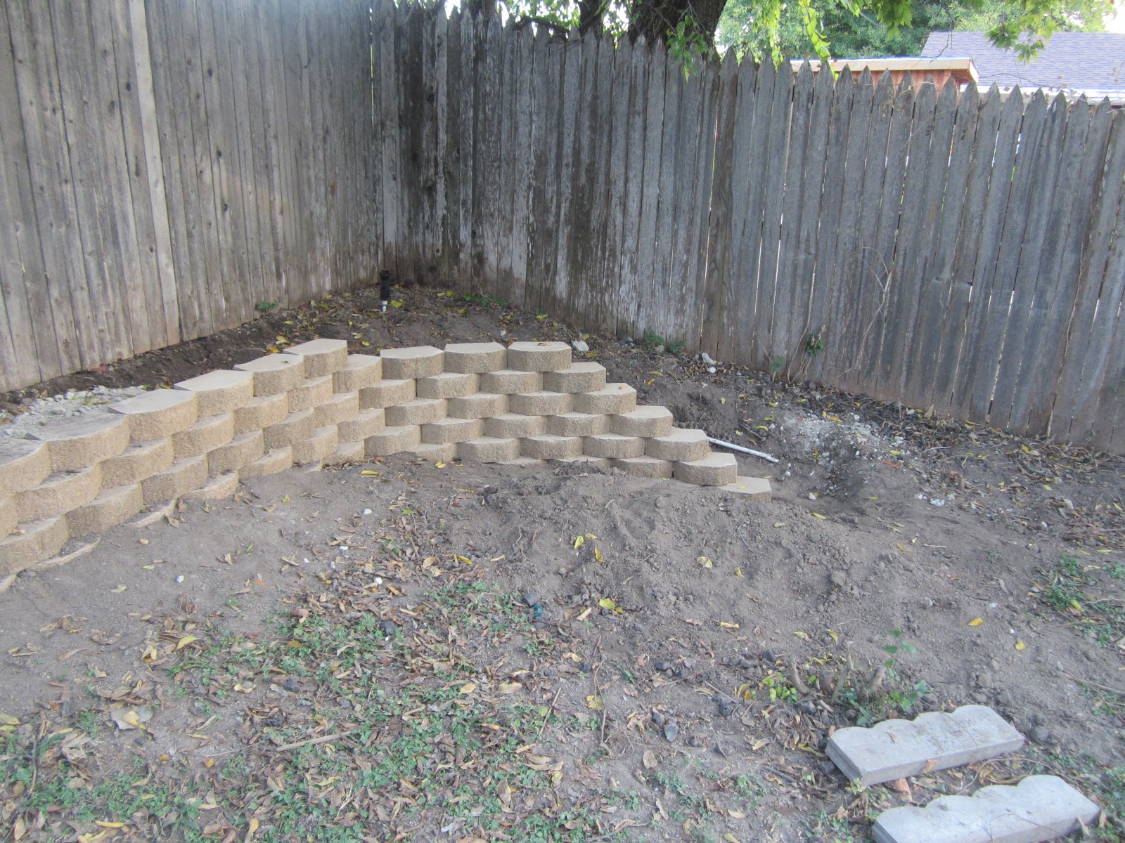 Getting each terrace to be level and at the right height compared to the blocks above and below it took 3 or 4 hours. That doesn't count the time I spent repairing the sprinkler line that I busted while digging out the foundation.